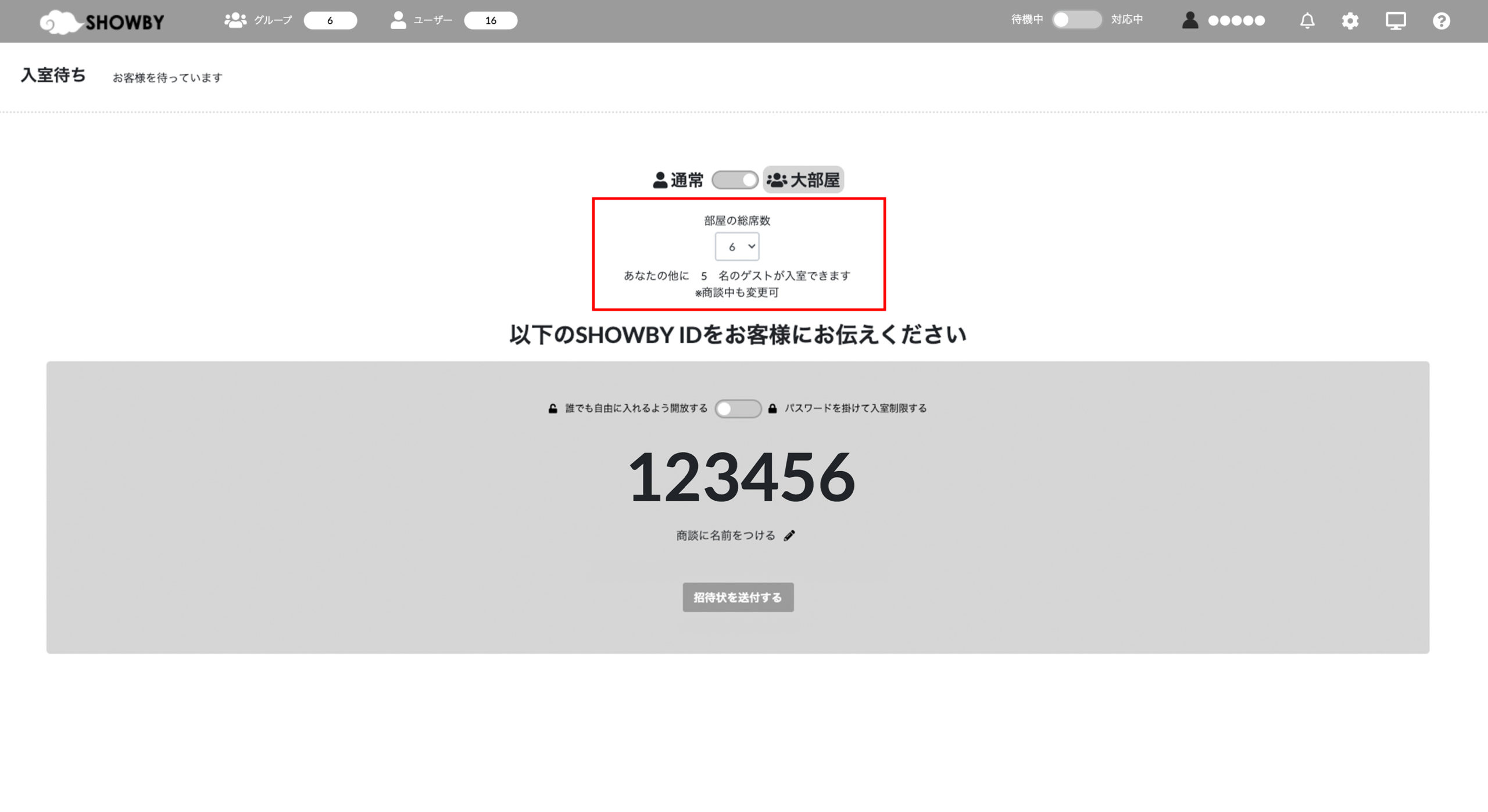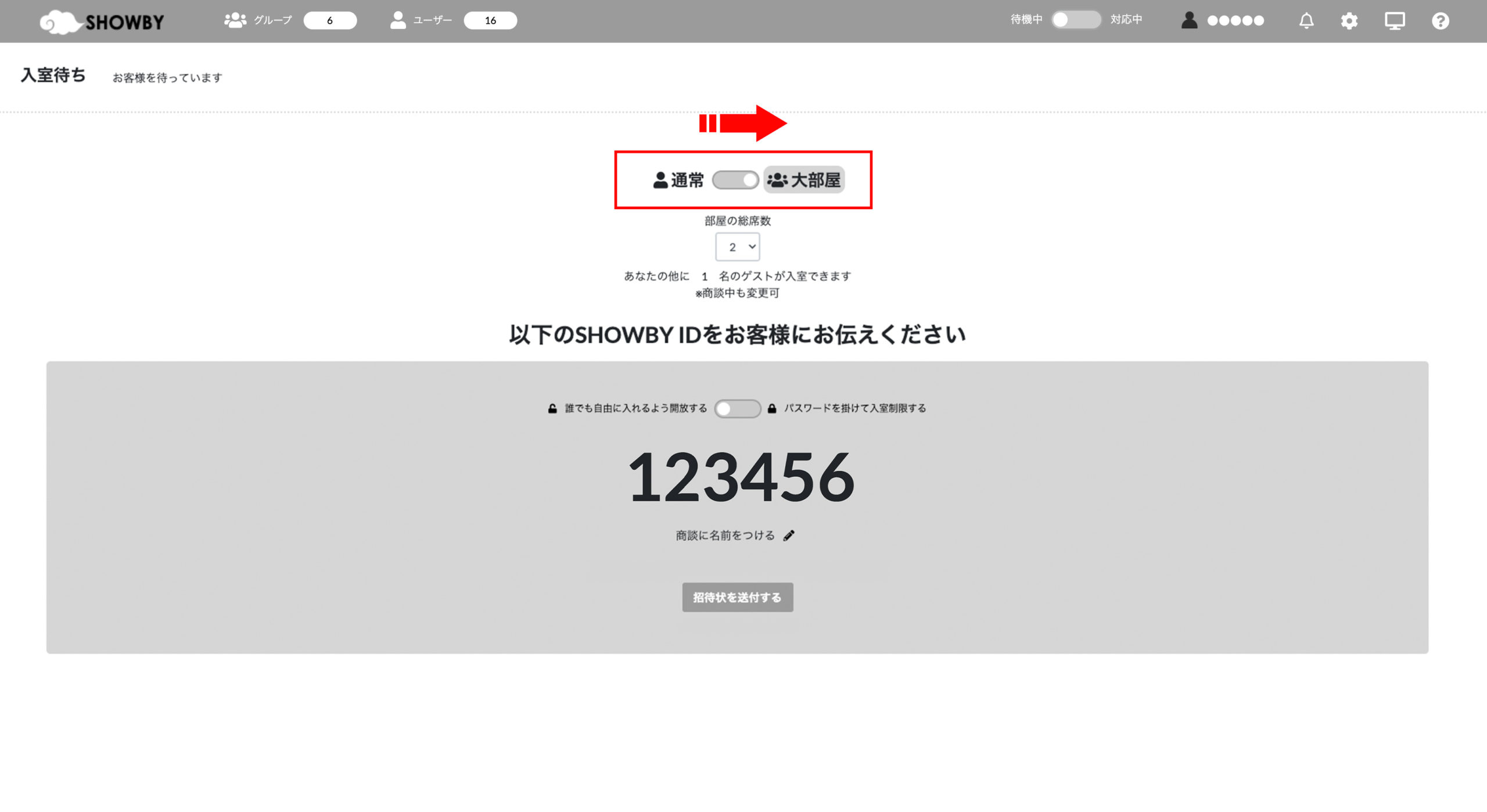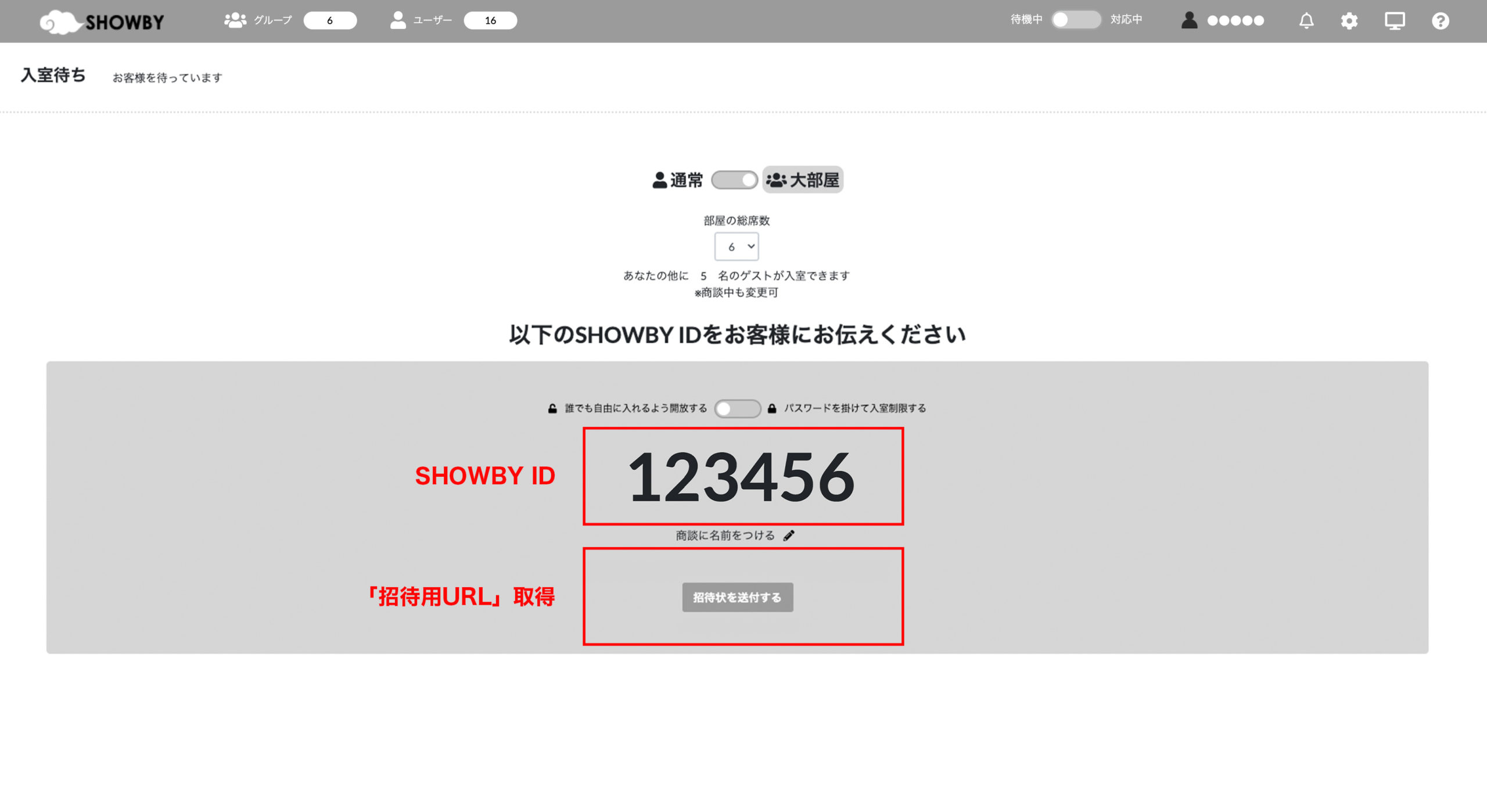 表示されているSHOWBY ID、もしくは「招待状を送付」から取得できる部屋のURLをゲストに伝えてください。