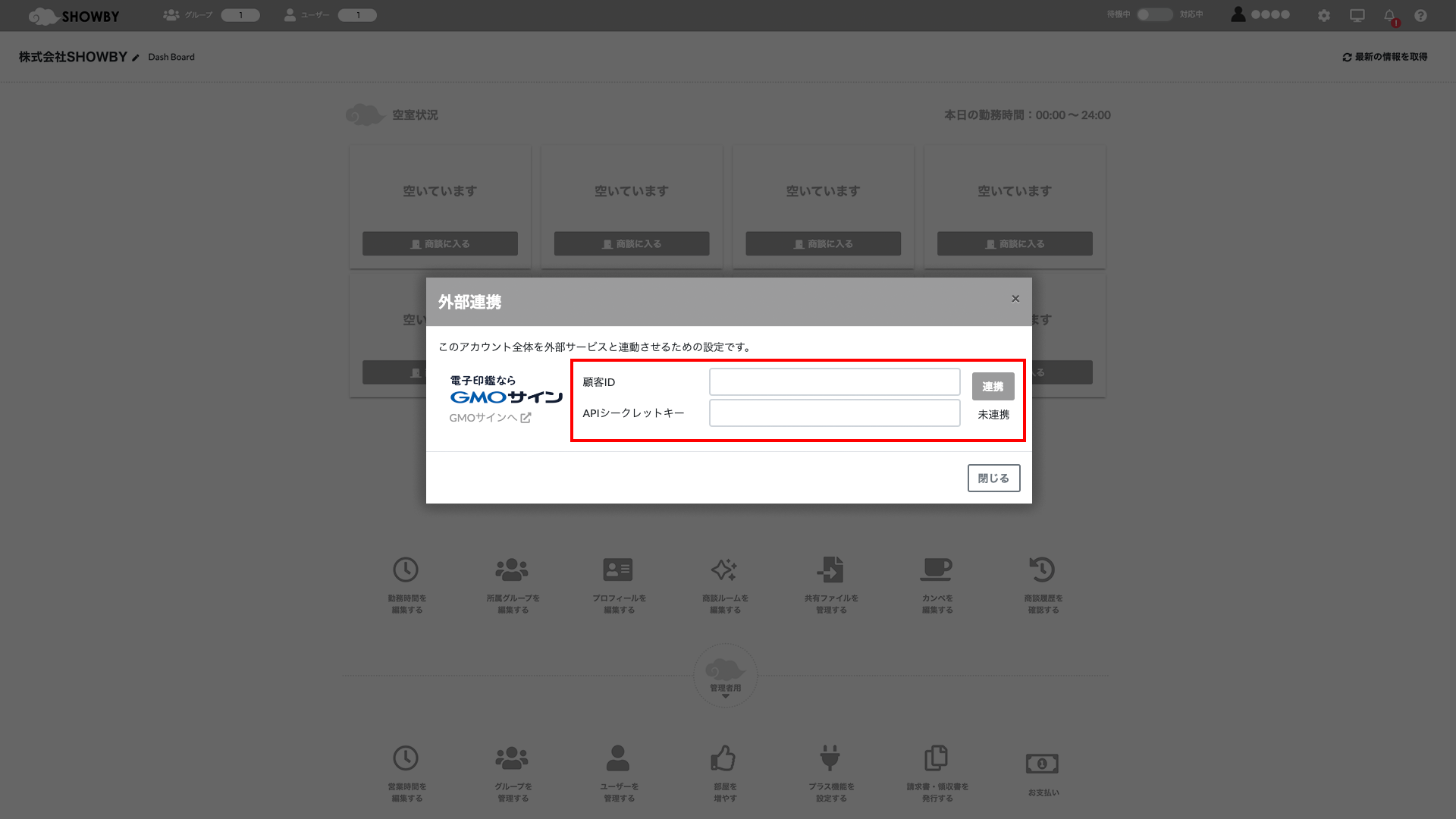 GMOサインから取得した「顧客ID」と「シークレットキー」を、SHOWBY側にセットする事で連携を実現します。